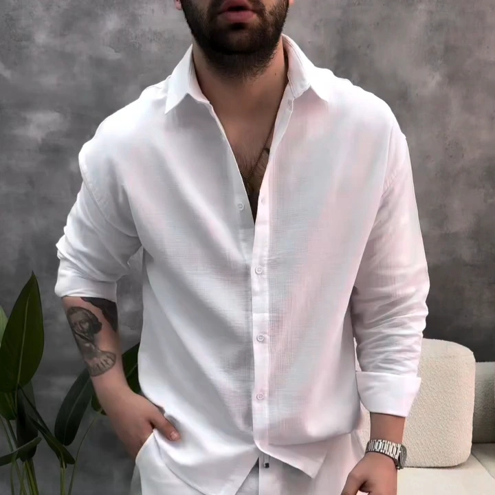 Discover your new warm-weather staple. This slim-fit set, featuring a shirt and pant in a breathable cotton-linen blend, is designed for effortless style and all-day comfort. Perfect for hot days and stylish outings.